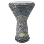 The drum is fitted with a white synthetic head that delivers powerful, crisp tones and comes with a premium padded carrying case for safe transport. Its body is adorned with a stunning traditional Arabic design, handcrafted from genuine mother of pearl in elegant blue patterns that reflect a vibrant spectrum of colors — making this darbuka both a musical instrument and a visual masterpiece.