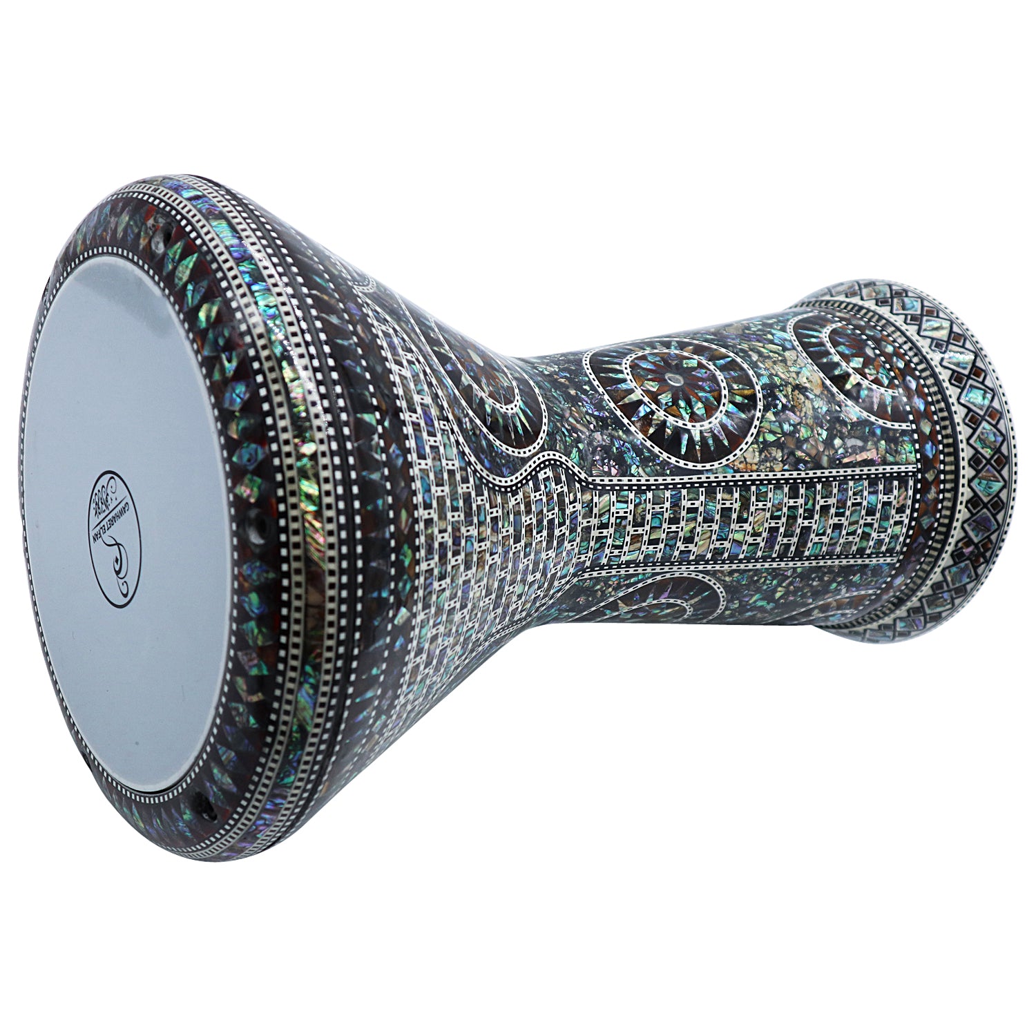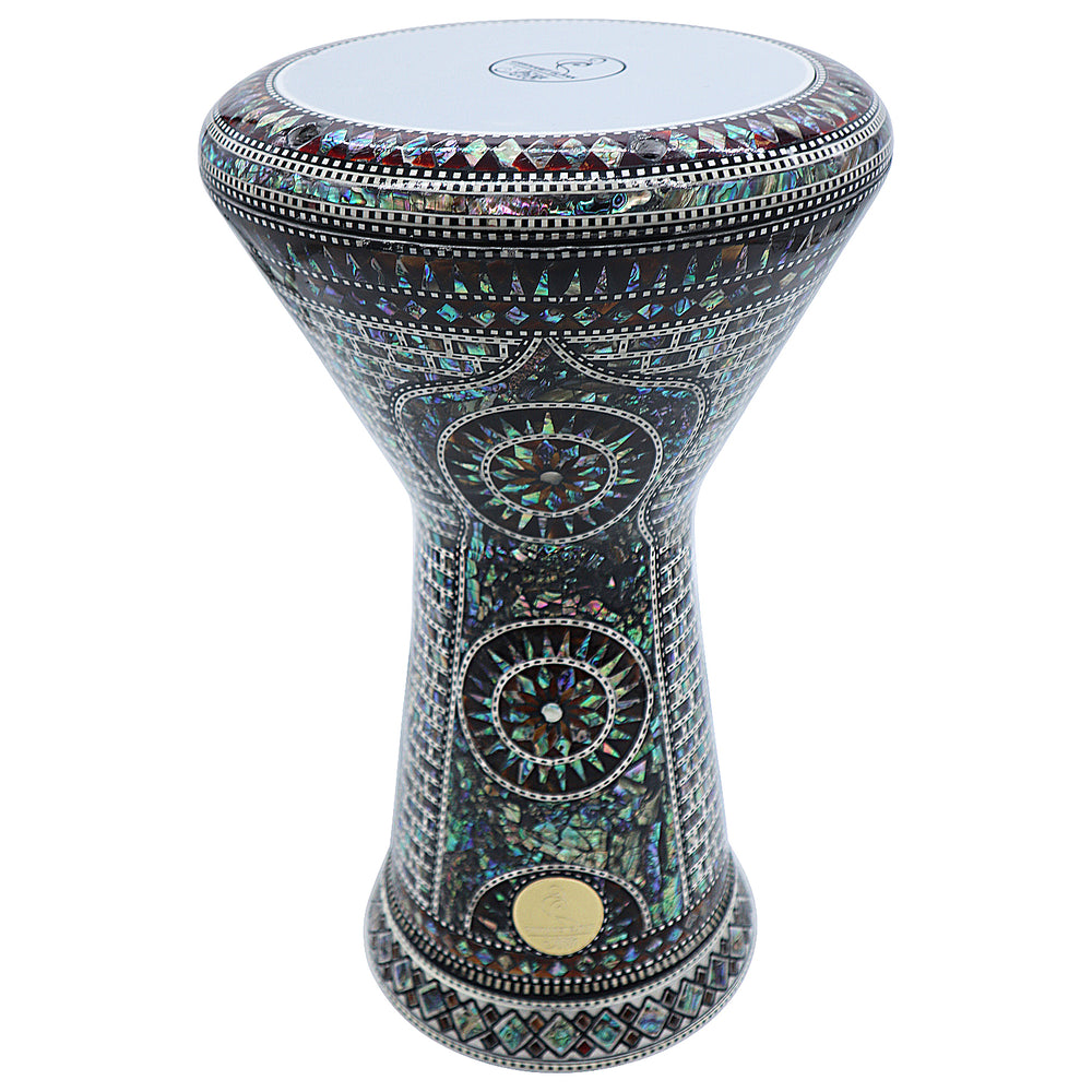 The 17.5'' New Generation 2.0 Darbuka is a top-quality drum from GEF that comes with extra synthetic skin and a premium case. Its steel construction allows for a wide range of sound, producing rich lows and crisp highs that are sure to impress. Crafted with unique precision and attention to detail, this darbuka offers a fantastic sound quality that can captivate anyone. The intricate inlay of real mother of pearl showcases a traditional Arabic pattern, adding to the beauty and cultural significance of this instrument. Additionally, the drum is covered with real mother of pearl, which reflects spectral colors and enhances the overall visual appeal of the instrument. The New Generation 2.0 Darbuka is a must-have for any percussionist looking for a high-quality, visually stunning instrument that produces an exceptional sound.