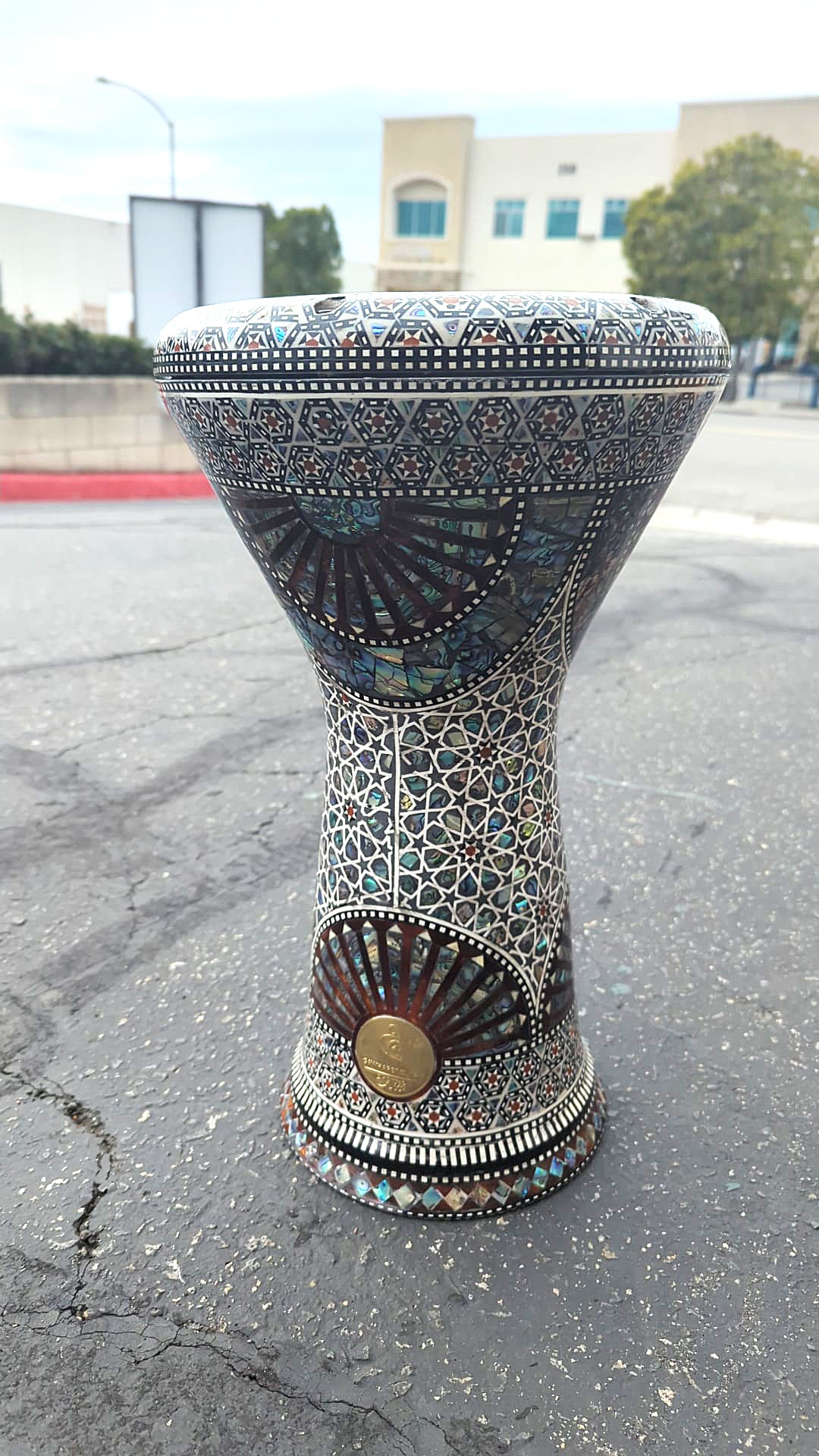 The 17.5'' New Generation 2.0 Darbuka is a top-quality drum from GEF that comes with extra synthetic skin and a premium case. Its steel construction allows for a wide range of sound, producing rich lows and crisp highs that are sure to impress. Crafted with unique precision and attention to detail, this darbuka offers a fantastic sound quality that can captivate anyone. The intricate inlay of real mother of pearl showcases a traditional Arabic pattern, adding to the beauty and cultural significance of this instrument. Additionally, the drum is covered with real mother of pearl, which reflects spectral colors and enhances the overall visual appeal of the instrument. The New Generation 2.0 Darbuka is a must-have for any percussionist looking for a high-quality, visually stunning instrument that produces an exceptional sound.