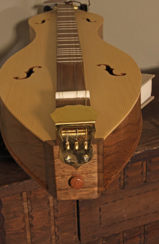 This Deluxe model offers the best features from the Roosebeck Mountain Dulcimer line! The vaulted fret board and the completely spruce soundboard are light weight and allow for more sound vibration, producing excellent sound quality. This mountain dulcimer has an hour glass shape and 4 of the classic f-hole openings on the sound board. The body, neck and fret board are solid walnut and the tail piece has a gold color and is shaped like a crown. The bridge and nut are bone. The carved scroll peg head features 4 gold colored mechanical geared straight tuners with a 4:1 ratio and there are 4 strings, including 2 melody strings, 1 middle string and 1 bass drone string. Many tunings will work, but we recommend the traditional DAD method to make it easy to pick up and play. The following accessories are included with item: pick, noter and owner's guide.