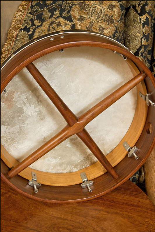 14 by 3.5 Inch Bodhran. Primary rhythmic accompaniment for Celtic and Irish music. The natural goatskin head has an attractive Roosebeck logo. The beautiful sheesham frame is trimmed by a black band. the drum is eaily tuned by adjusting hardware hidden inside. Equipped with fixed cross bars to help support hand and wrist when applying pressure to head from inside of frame.