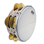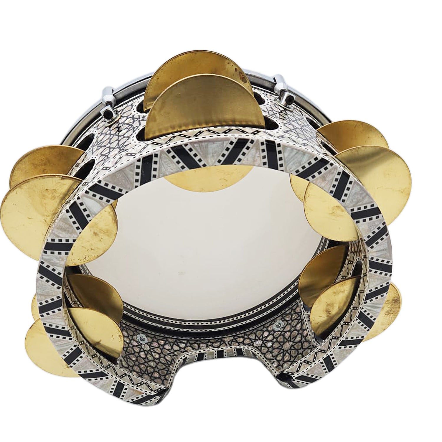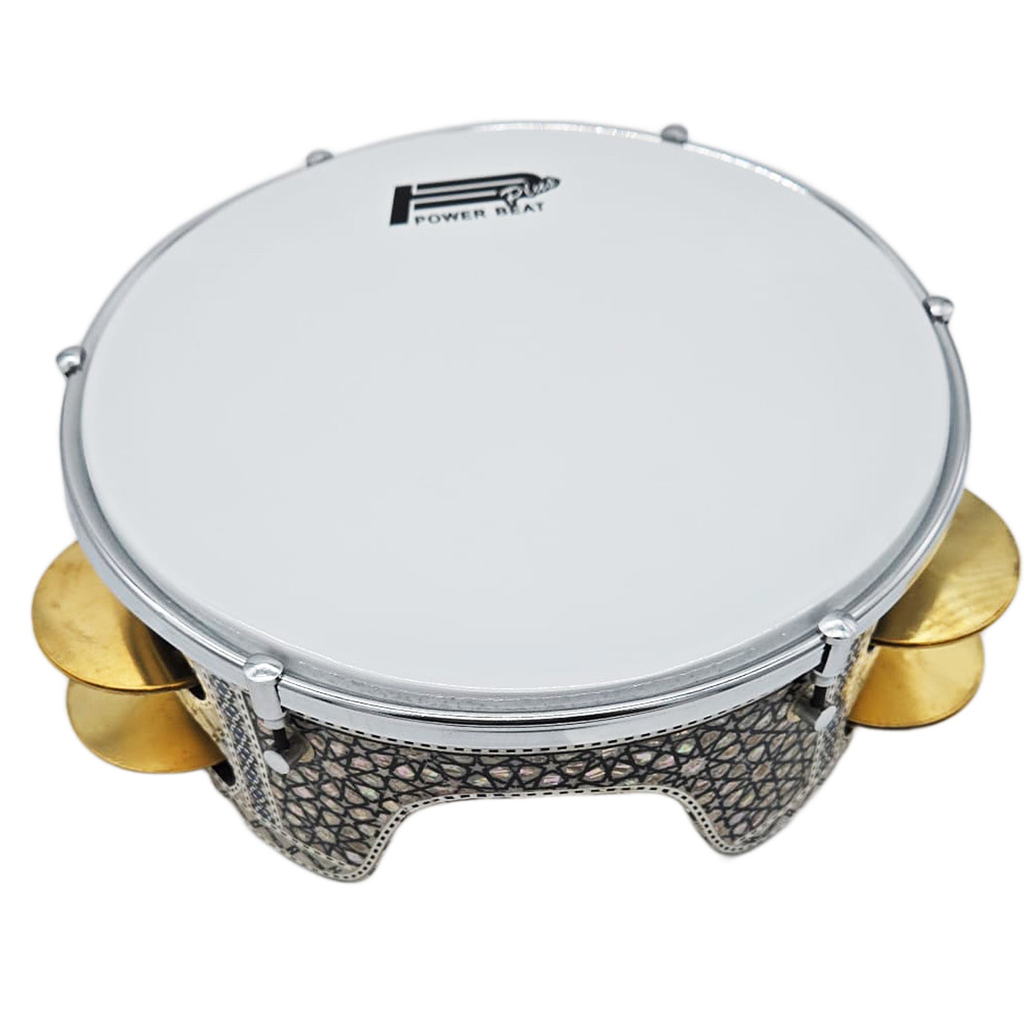 The 12" Gawharet El Fan Professional Mother of Pearl Mazhar features advanced tuning lugs, a tunable PowerBeat transparent plastic head, and 6 pairs of brass zills, delivering both visual elegance and authentic Arabic percussion sound. This handcrafted wooden Mazhar arrives directly from Egypt, beautifully decorated with real mother-of-pearl inlay.