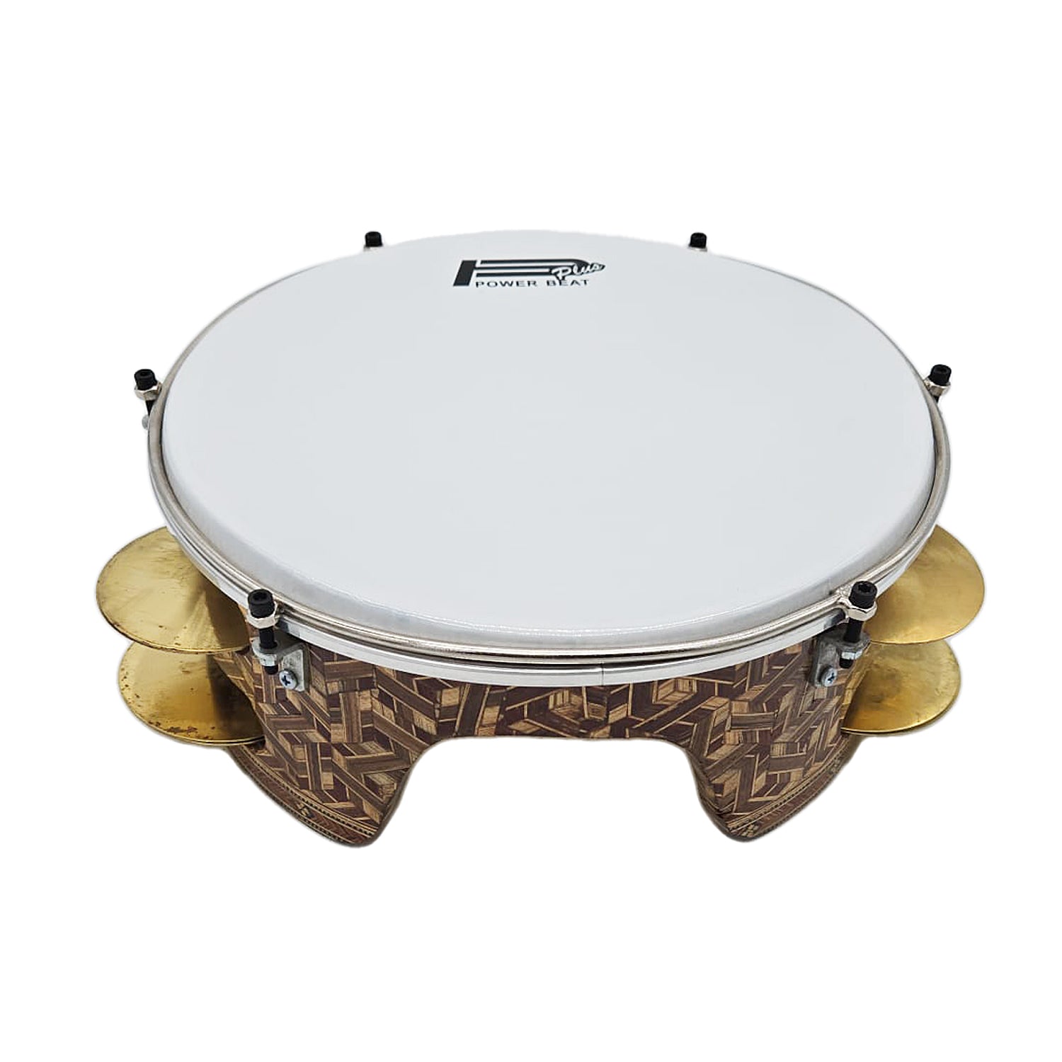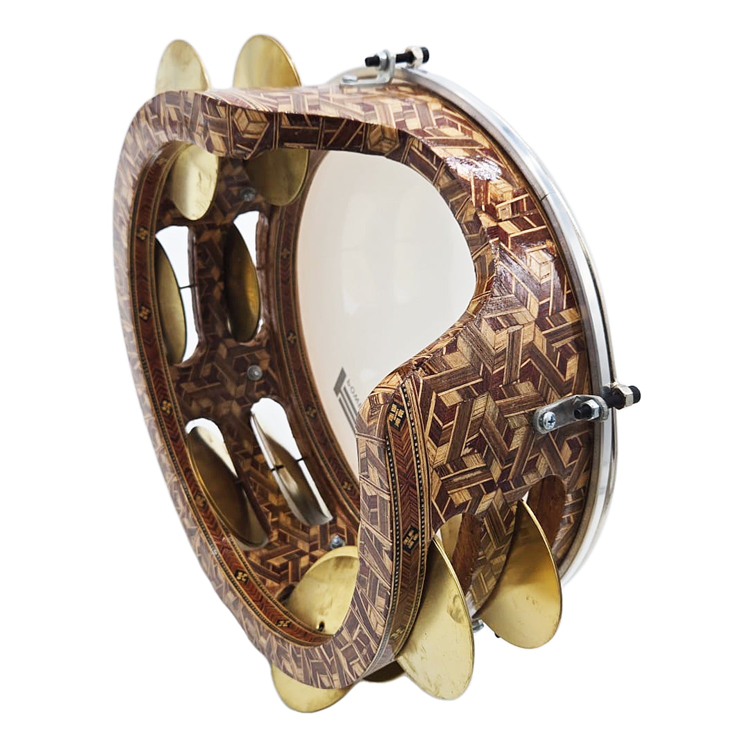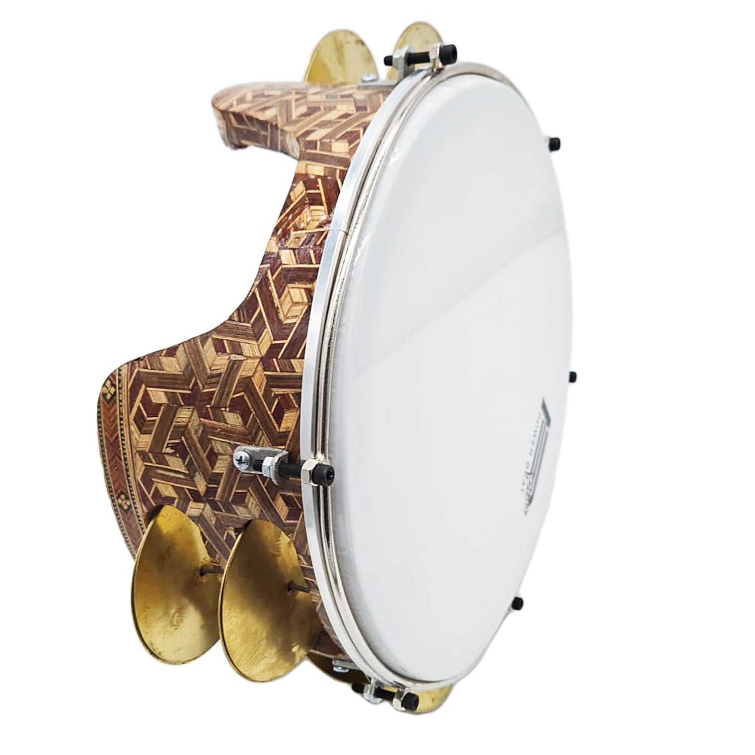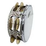 The Mazhar is a traditional Egyptian frame drum featuring a tunable plastic head for precise sound control, along with brass zills that add a lively and authentic Sound. This 12" Gawharet El Fan Professional Wood Mazhar comes equipped with 8 tuning lugs and 6 pairs of zills, offering excellent tone and resonance.