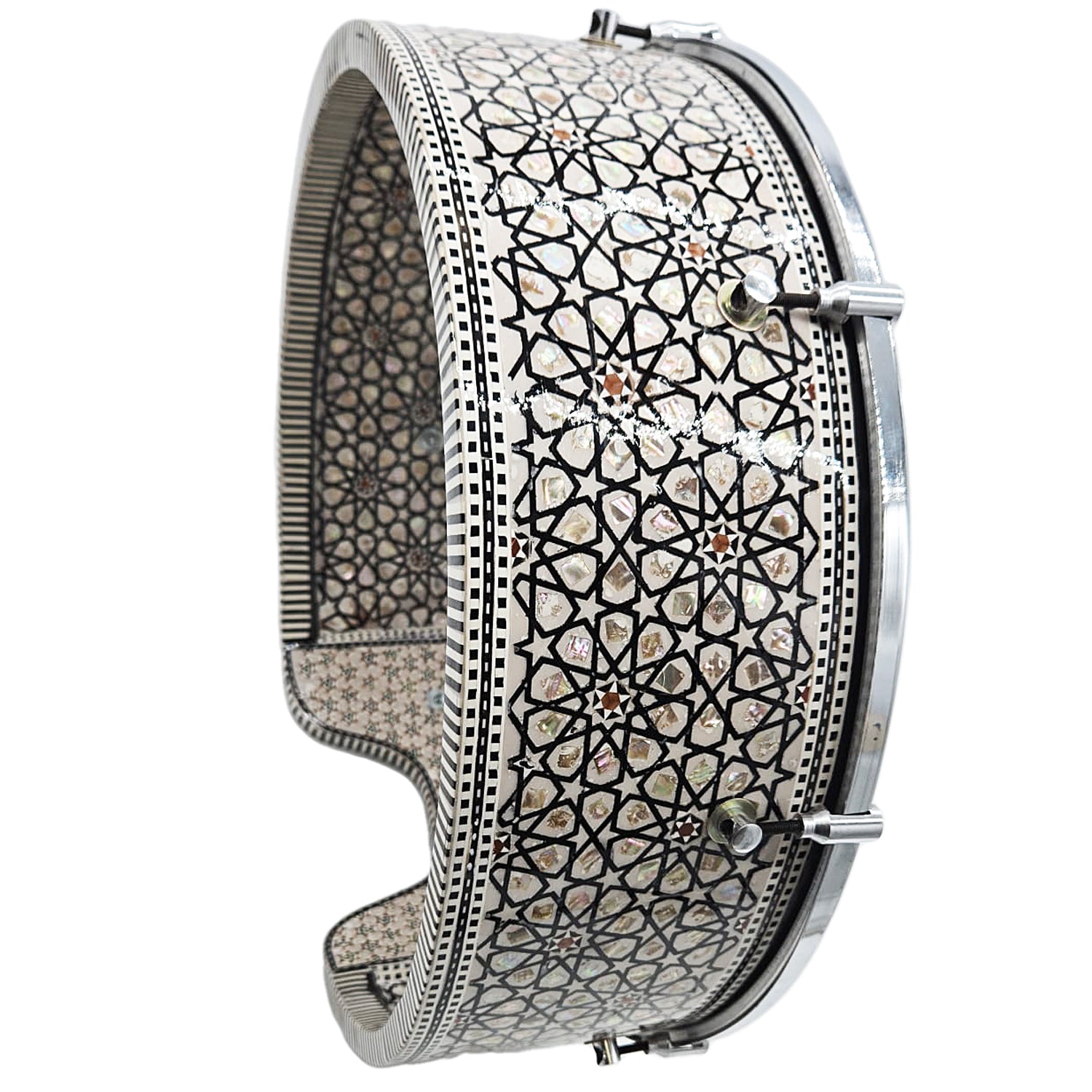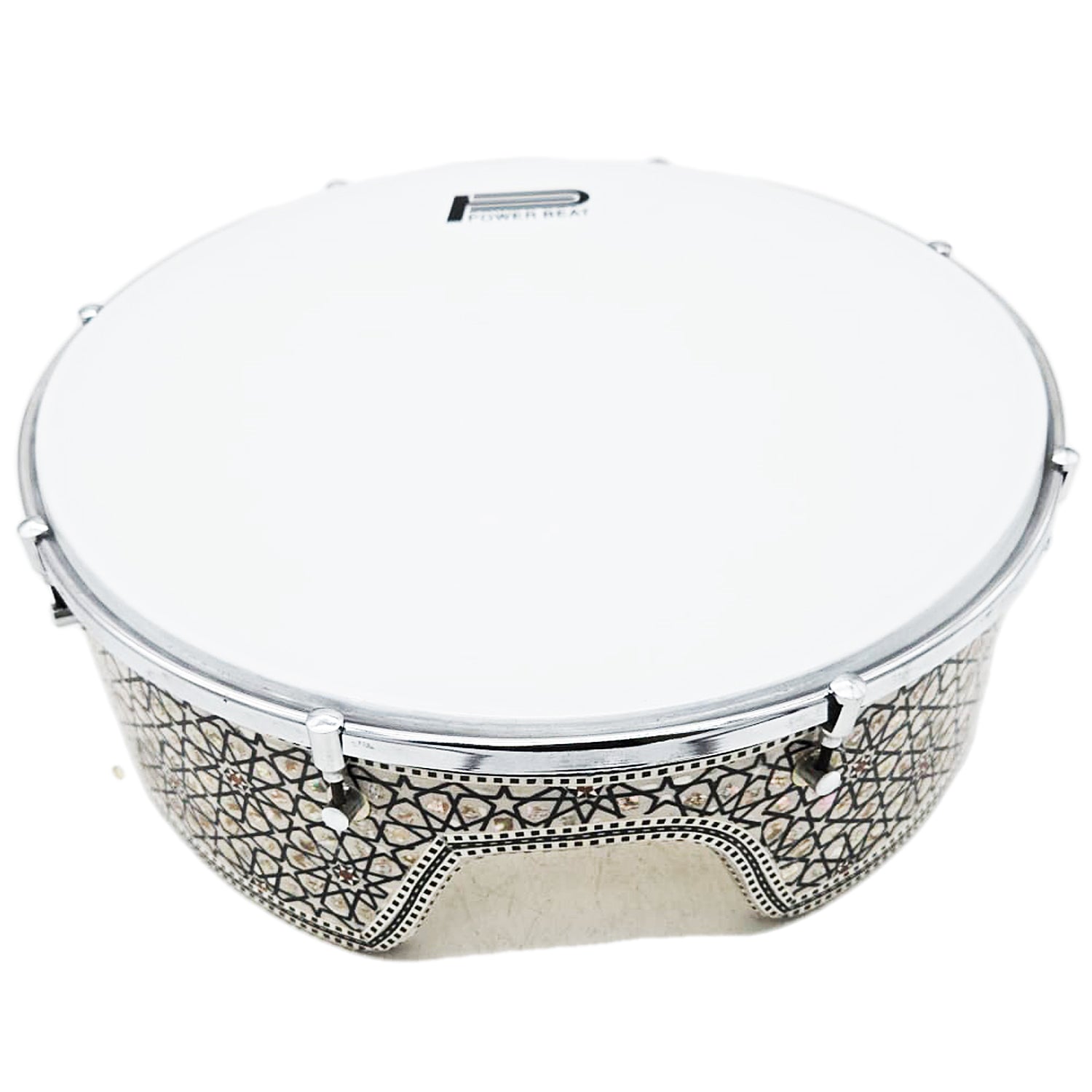 The Dof (Daf) is a large traditional Egyptian frame drum featuring a tunable plastic PowerBeat professional head and 8 tuning lugs for precise sound adjustment. This model by Gawharet El Fan arrives directly from Egypt and showcases a beautiful mother-of-pearl decorated wooden frame, combining authentic craftsmanship with modern performance features.