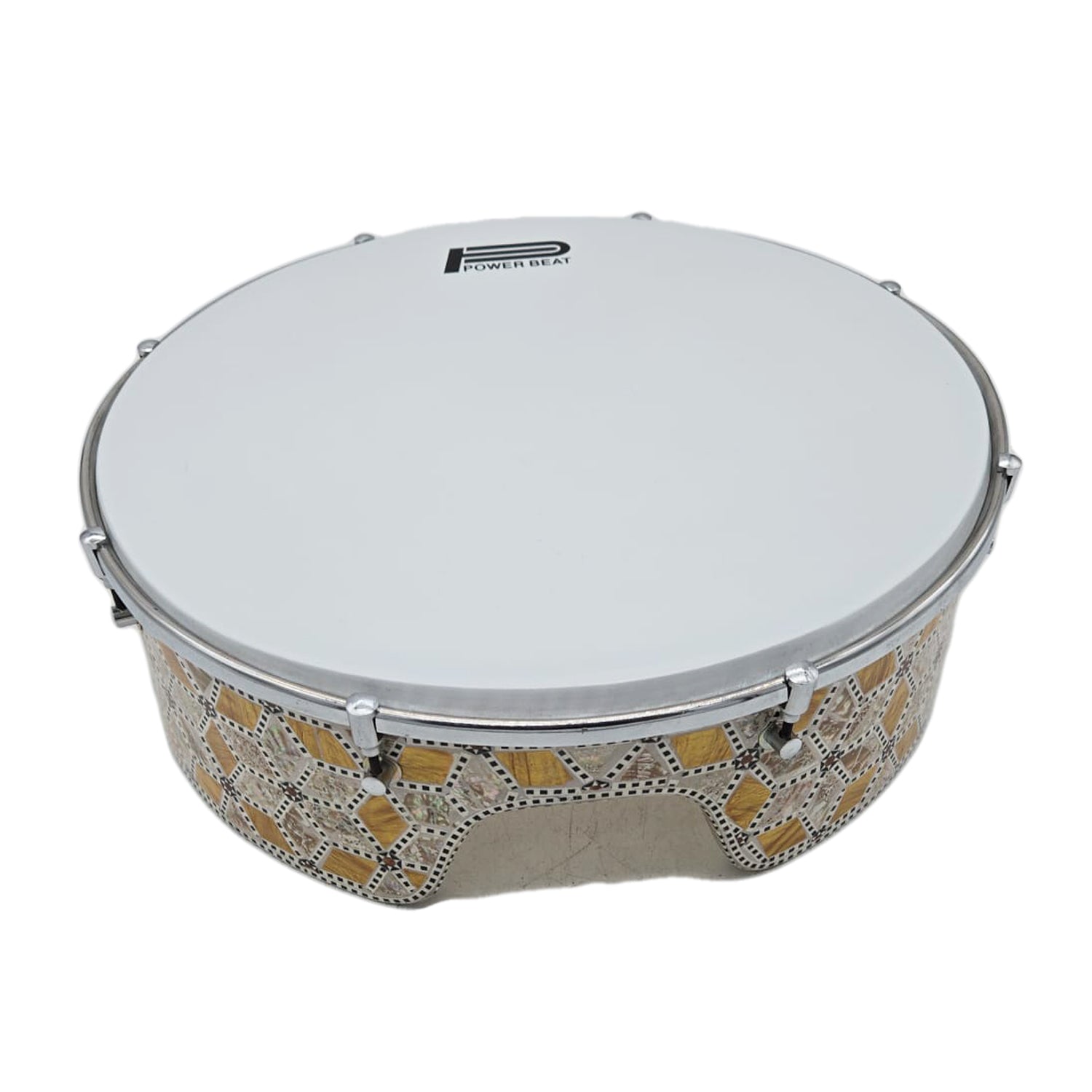 The Dof (Daf) is a large traditional Egyptian frame drum featuring a tunable plastic PowerBeat professional head and 8 tuning lugs for precise sound adjustment. This model by Gawharet El Fan arrives directly from Egypt and showcases a beautiful mother-of-pearl decorated wooden frame, combining authentic craftsmanship with modern performance features.