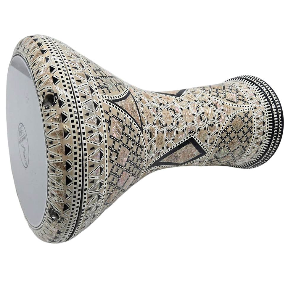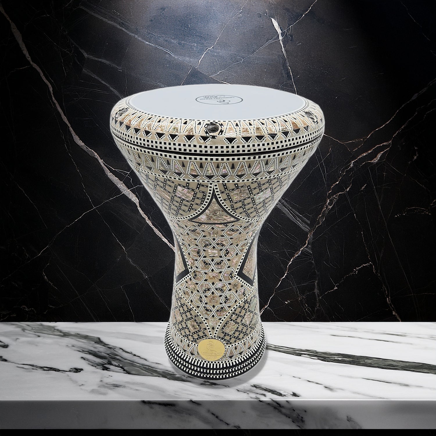 This high-end 17" Mother of Pearl Darbuka is a breathtaking work of art, boasting intricate inlays of real mother of pearl atop its top-quality aluminum body. Its reflective shell pattern will captivate the eye and the ear, elevating your music to new heights. Complete with a clear synthetic head and a padded premium case for added protection, this drum is perfect for any performance or recording session. Whether a professional musician or a beginner, don't miss the opportunity to experience the beauty and craftsmanship of this incredible instrument - order yours today!