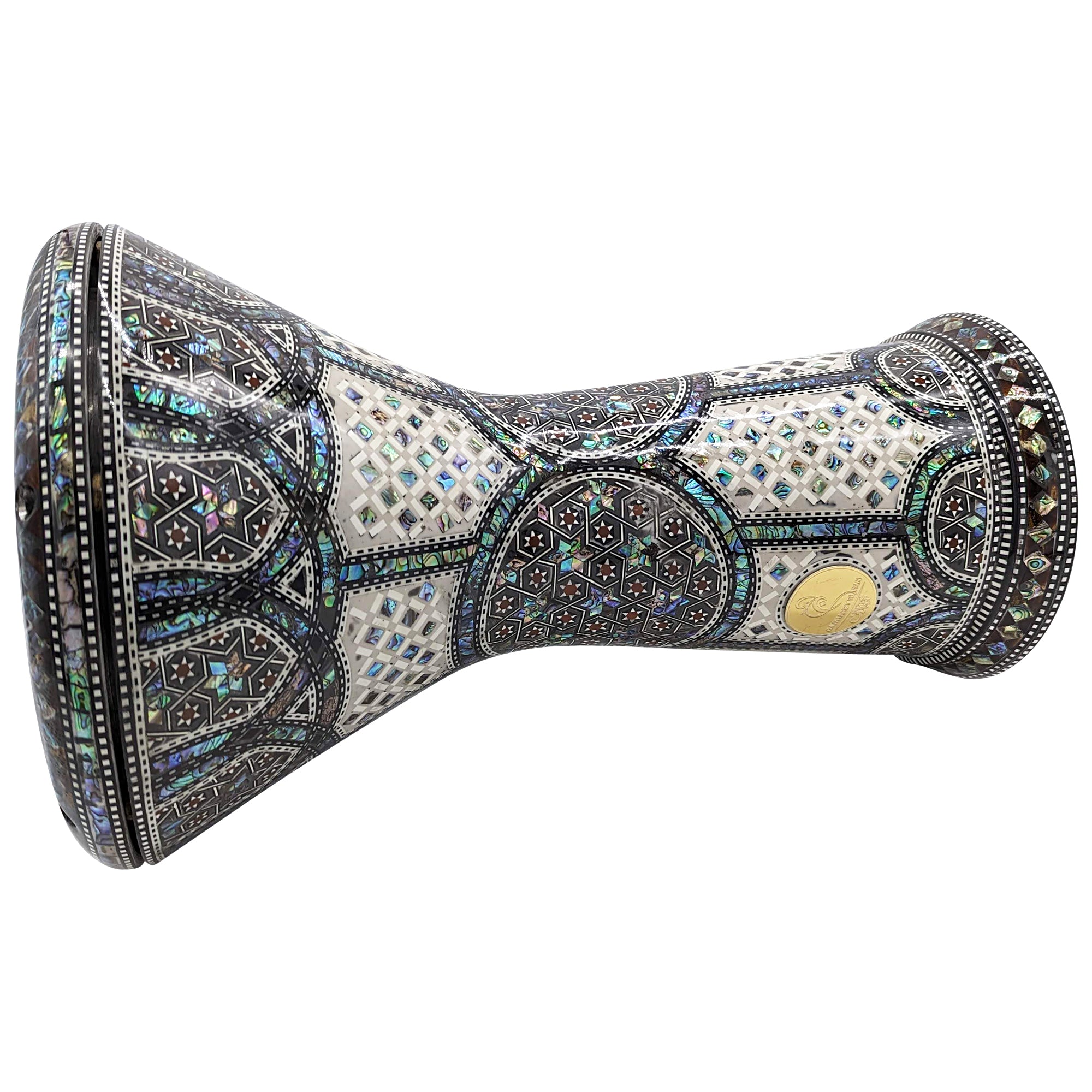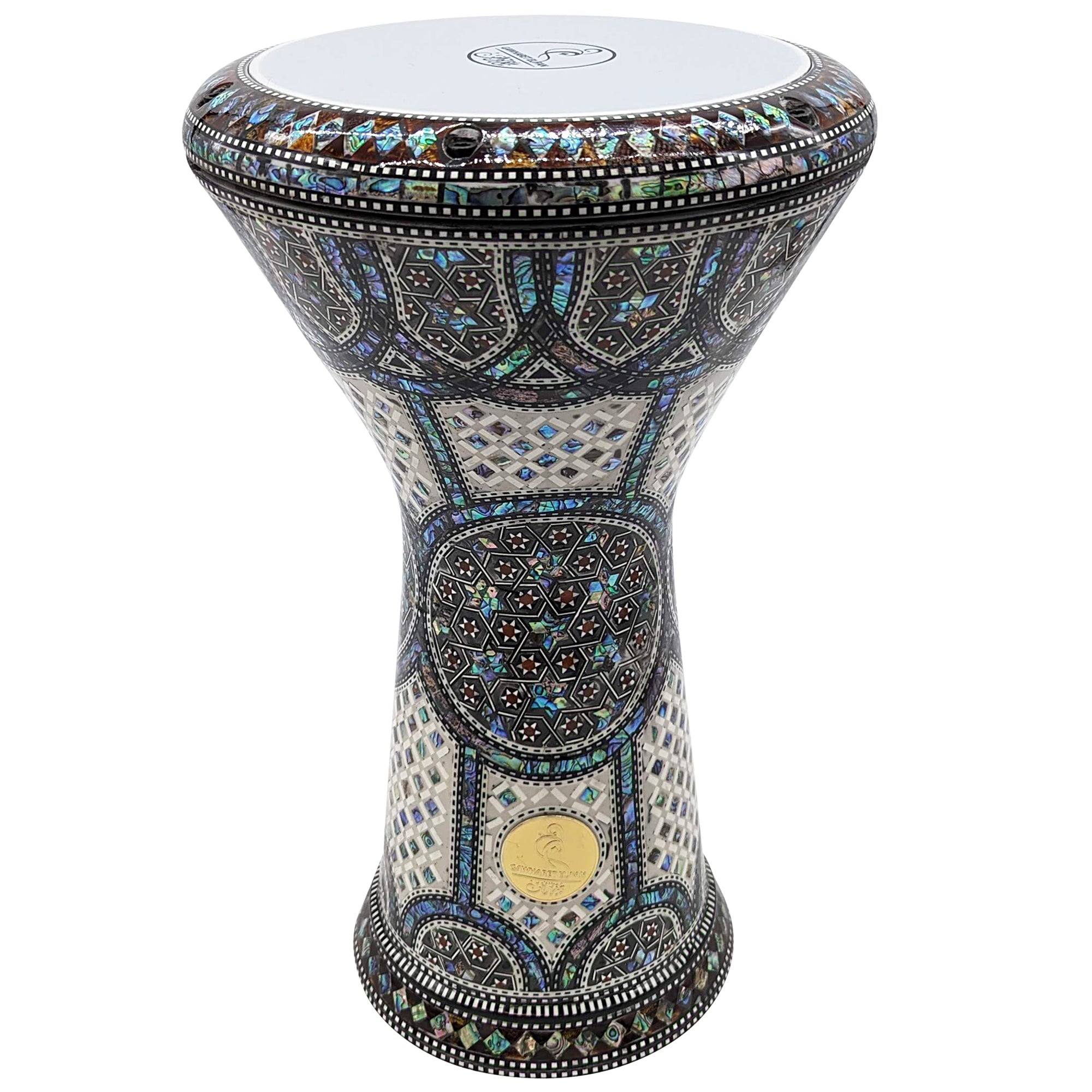 The 17.5'' New Generation 2.0 Darbuka is a top-quality drum from GEF that comes with extra synthetic skin and a premium case. Its steel construction allows for a wide range of sound, producing rich lows and crisp highs that are sure to impress. Crafted with unique precision and attention to detail, this darbuka offers a fantastic sound quality that can captivate anyone. The intricate inlay of real mother of pearl showcases a traditional Arabic pattern, adding to the beauty and cultural significance of this instrument. Additionally, the drum is covered with real mother of pearl, which reflects spectral colors and enhances the overall visual appeal of the instrument. The New Generation 2.0 Darbuka is a must-have for any percussionist looking for a high-quality, visually stunning instrument that produces an exceptional sound.