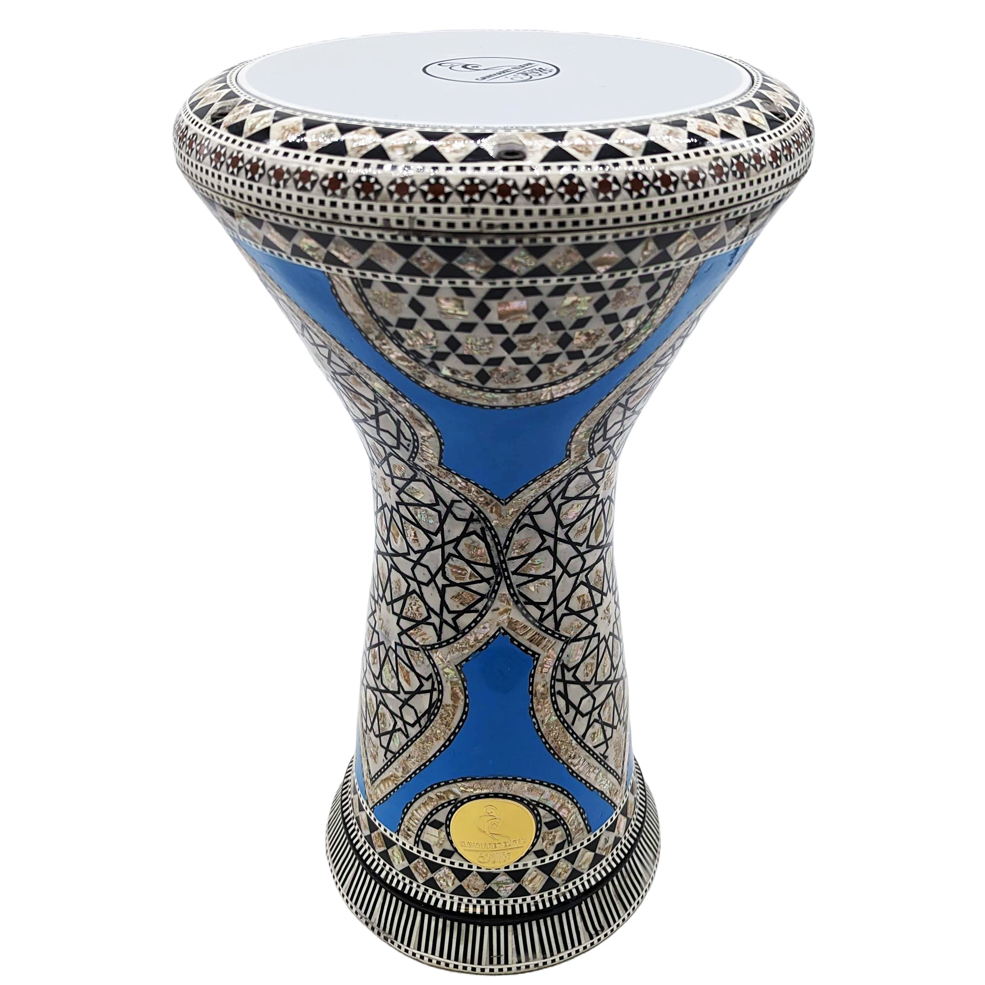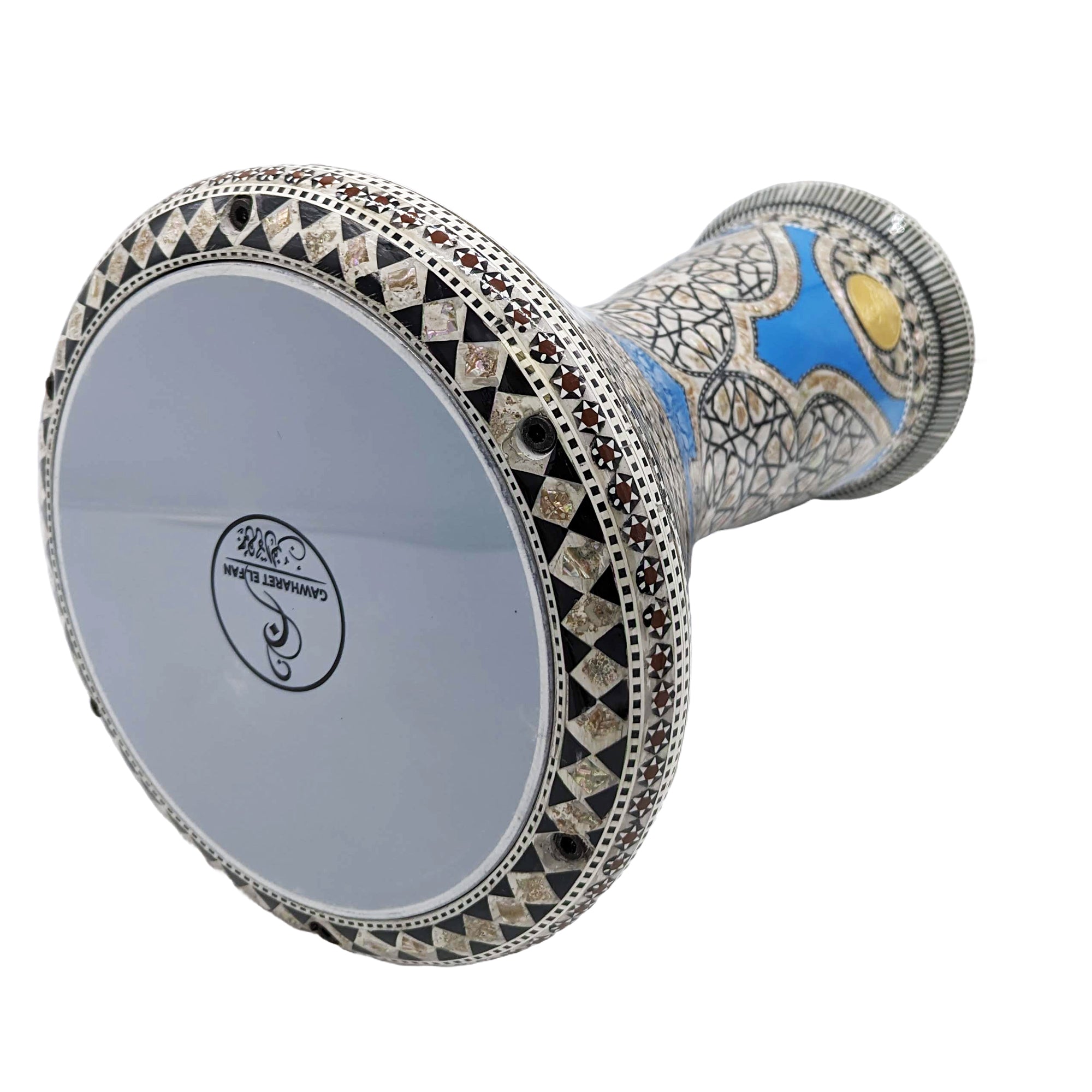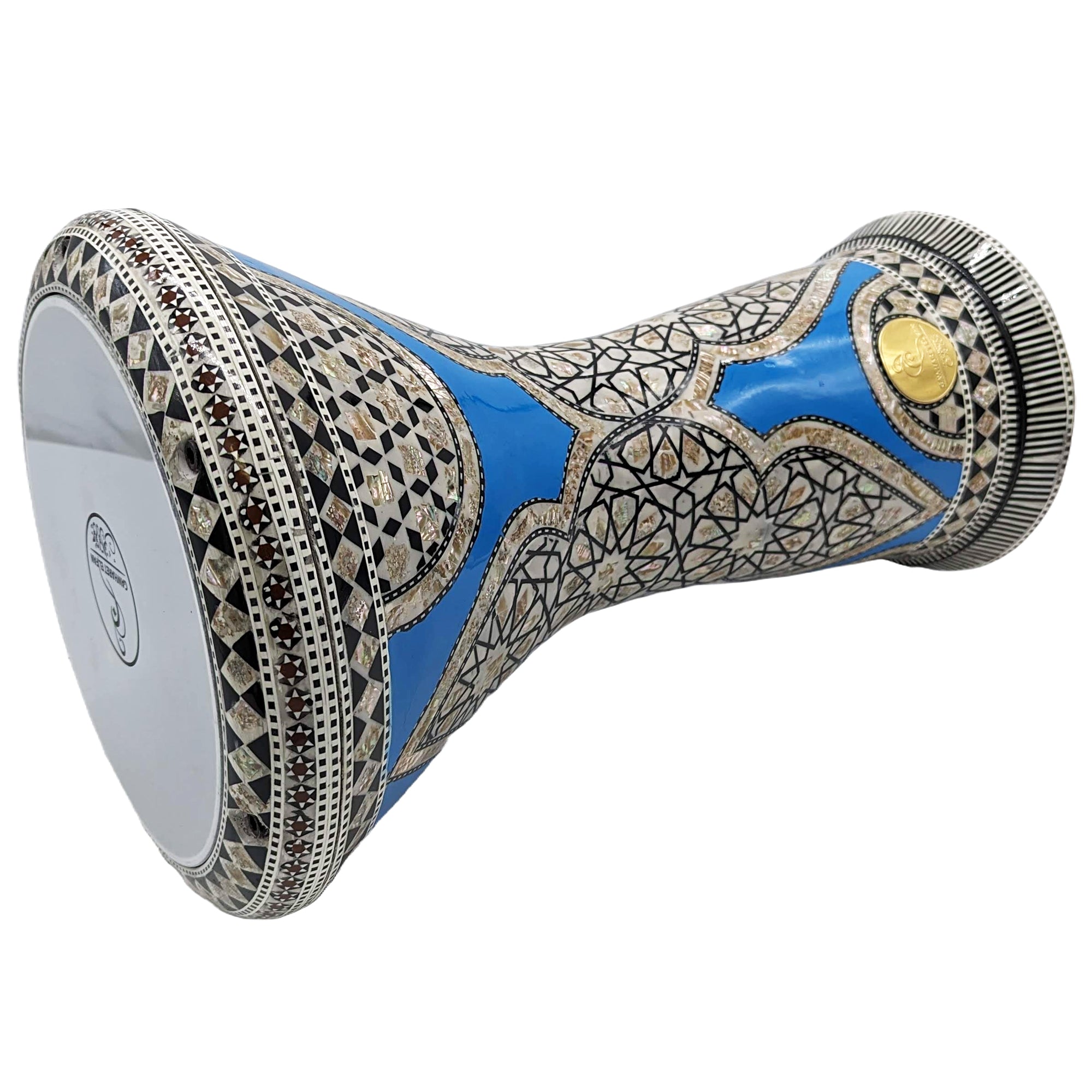 The drum is fitted with a white synthetic head that delivers powerful, crisp tones and comes with a premium padded carrying case for safe transport. Its body is adorned with a stunning traditional Arabic design, handcrafted from genuine mother of pearl in elegant blue patterns that reflect a vibrant spectrum of colors — making this darbuka both a musical instrument and a visual masterpiece.