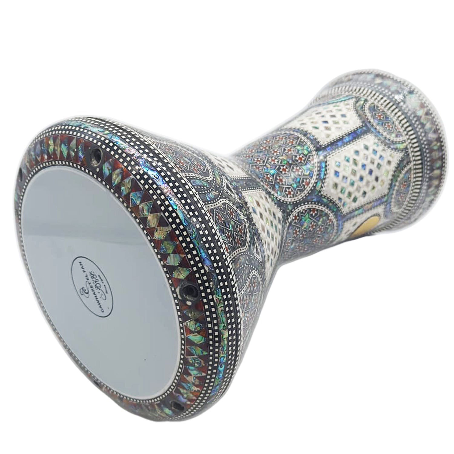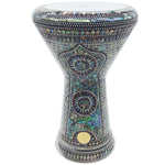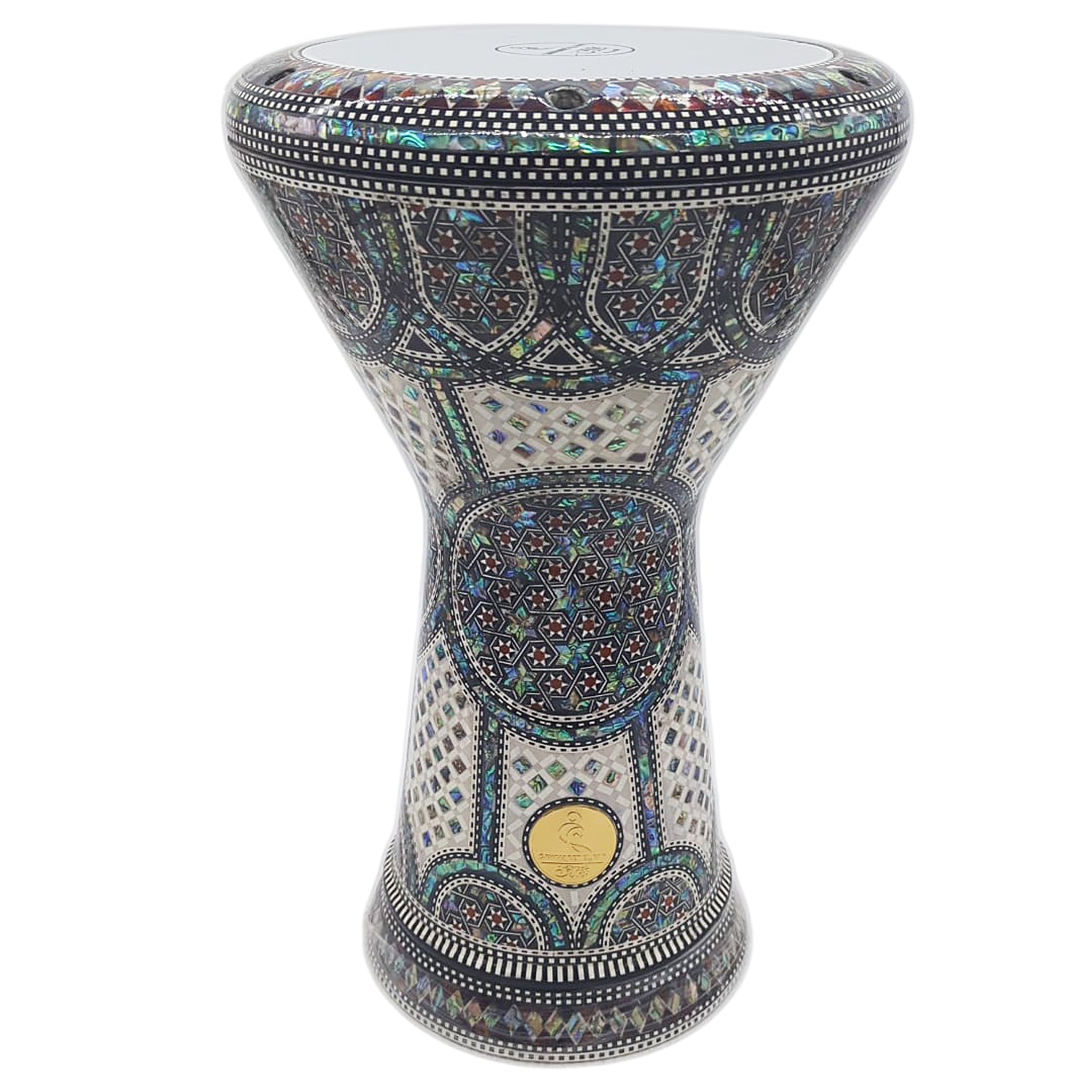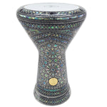 Crafted from top-quality materials, this renewed version of one of GEF's most famous patterns features two levels on the bottom and a wider diameter for an even deeper, more resonant sound. With beautiful shell colors and a shiny blue finish, this Doumbek is covered with real mother of pearl shells that reflect spectral colors in stunning patterns, including real green mother of pearl.