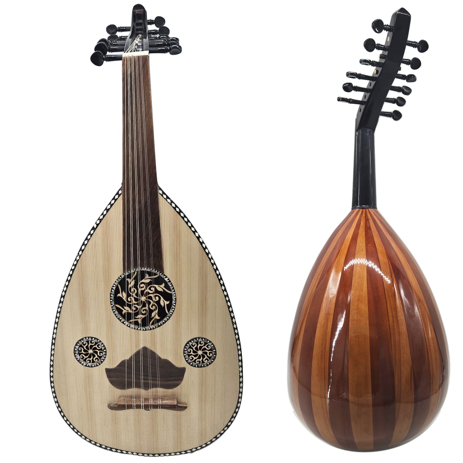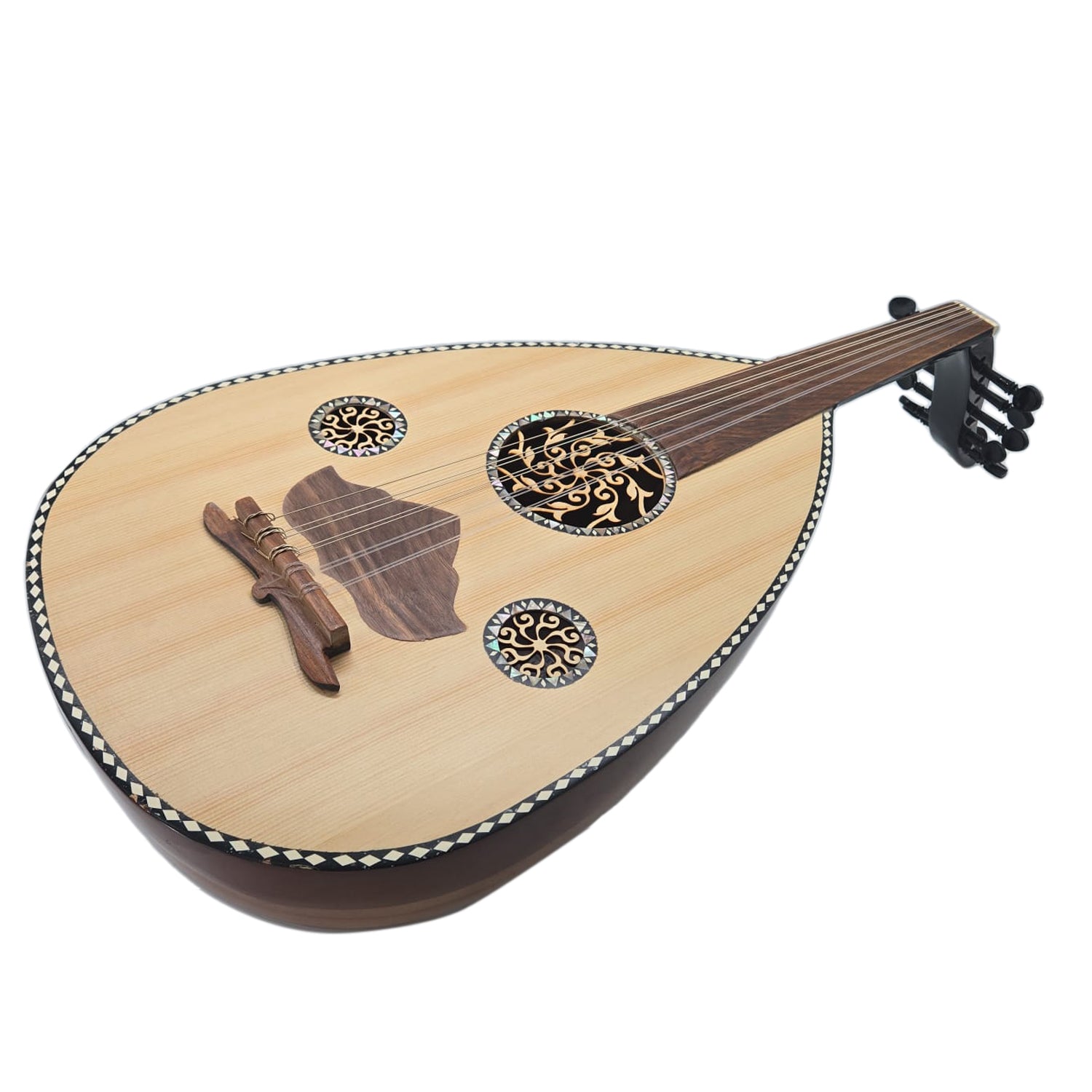 The Oud is a traditional Middle Eastern instrument with a pear-shaped body, 9 (upgradable to 12) strings, and a fretless neck, known for its deep and expressive sound.