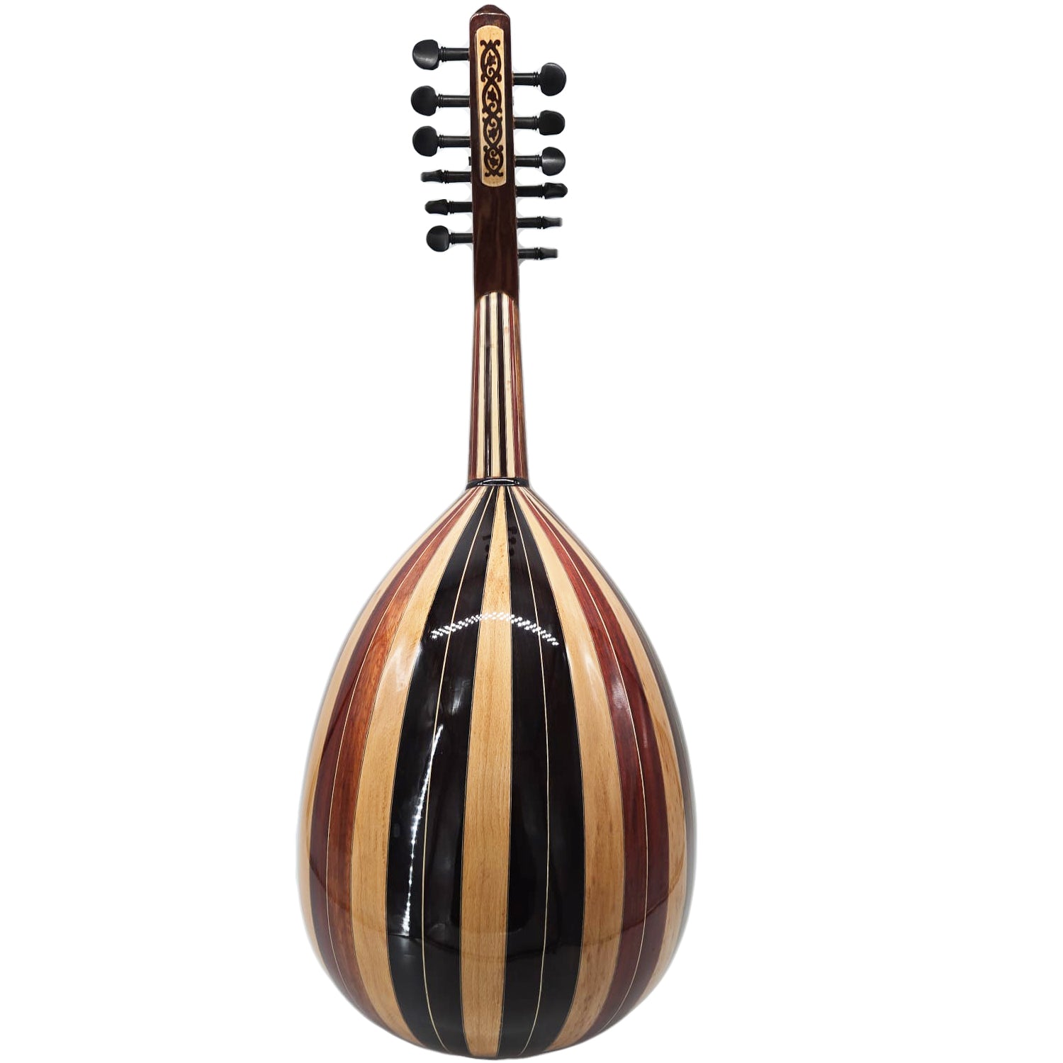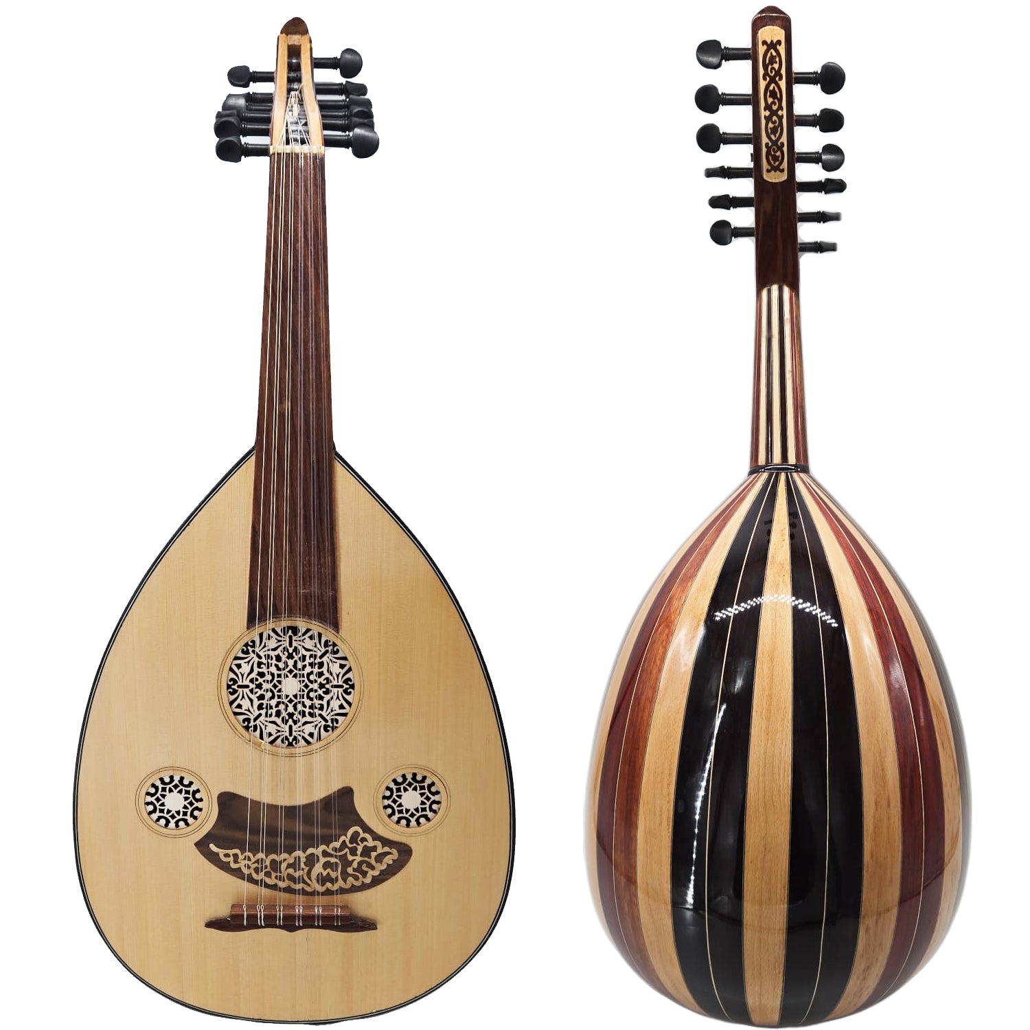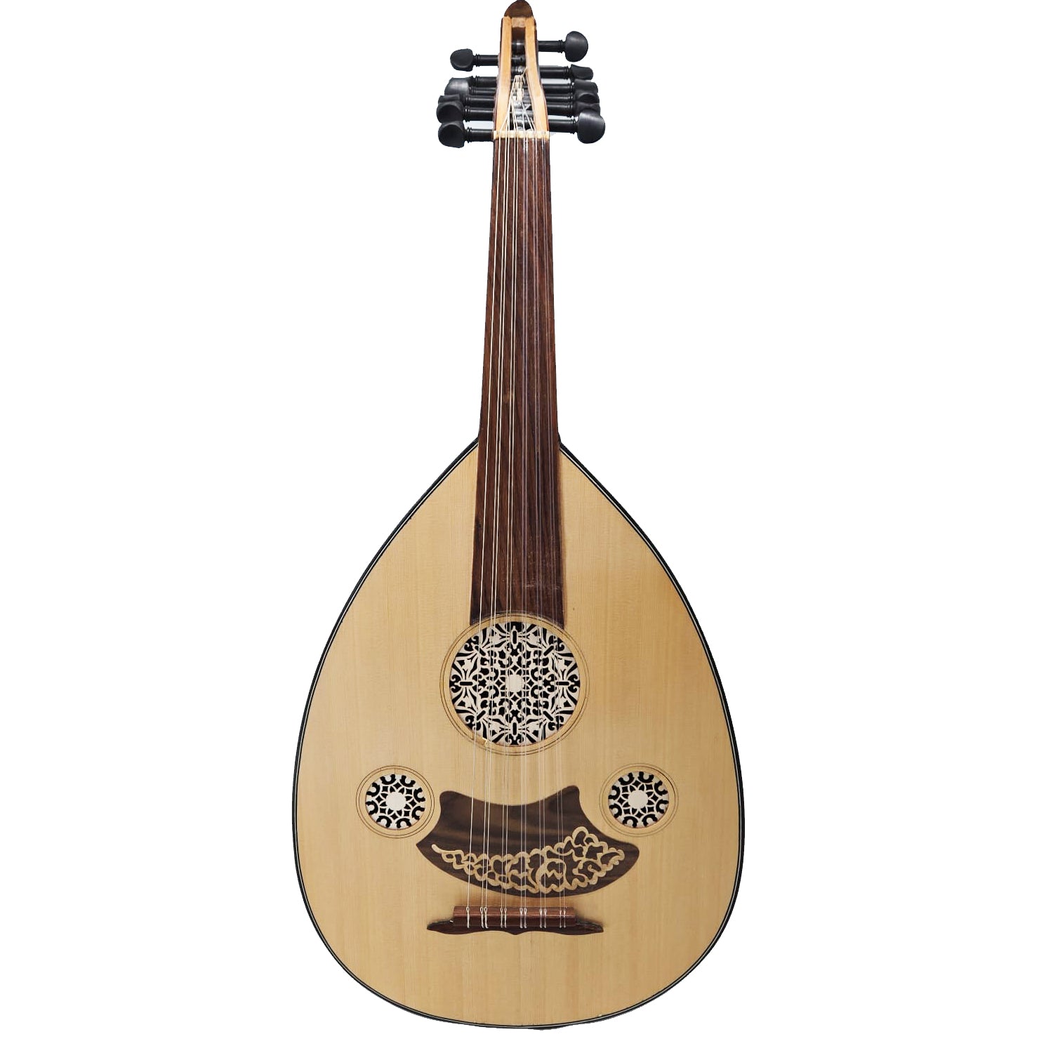 The oud is a highly ornate wooden instrument featuring paired strings, a pear-shaped body, and a fretless neck, allowing for expressive and nuanced musical performance.
