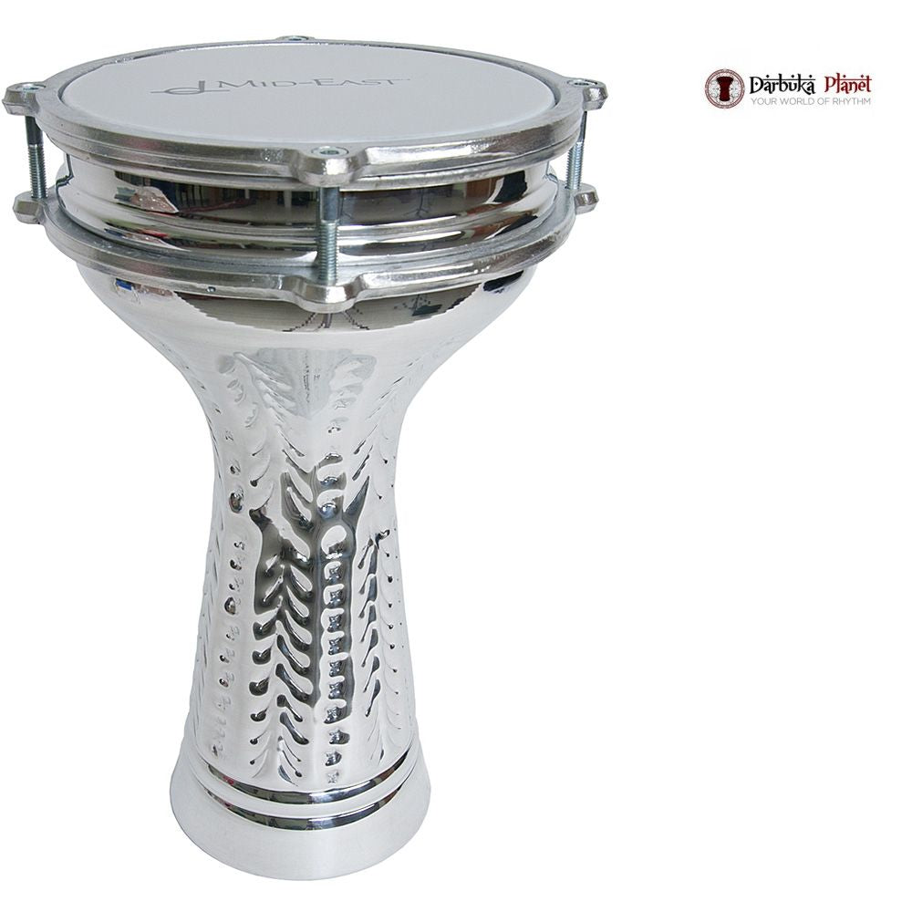 This aluminum doumbek has a sleek, silver appearance. The drum shell is covered in geometric and organic engravings, which may vary from drum to drum. The synthetic head may be mounted and tuned using four bolts.