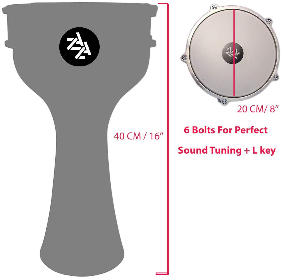 The Zaza Percussion 16" Doumbek is crafted with the vision of perfecting the doumbek sound while combining uncompromising style, quality materials, and affordability. Designed from lightweight aluminum (just around 2 lbs), it is easy to carry—making it ideal for beginners of any age, while also serving as an excellent addition to any professional drummer’s collection.
