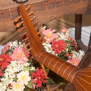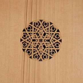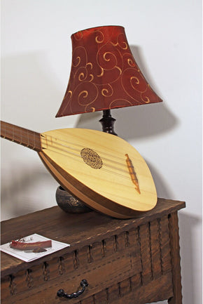 Eight course lute with natural finish. Features sheesham scalloped staves that have white pinstripes in between on the body. The neck, end peg and tuning pegs/levers are also made out of sheesham. The Nut is made of Bone. The sound board is made out of spruce wood and its one sound hole has an intricate laser cut design. There is also a beautiful laser cut design on the back of peg box. This lute has 8 nylon frets on neck and 4 finished sheesham frets on sound board. The bridge is made out of sheesham with a top plate made out of lace wood and has a mustache shape.
