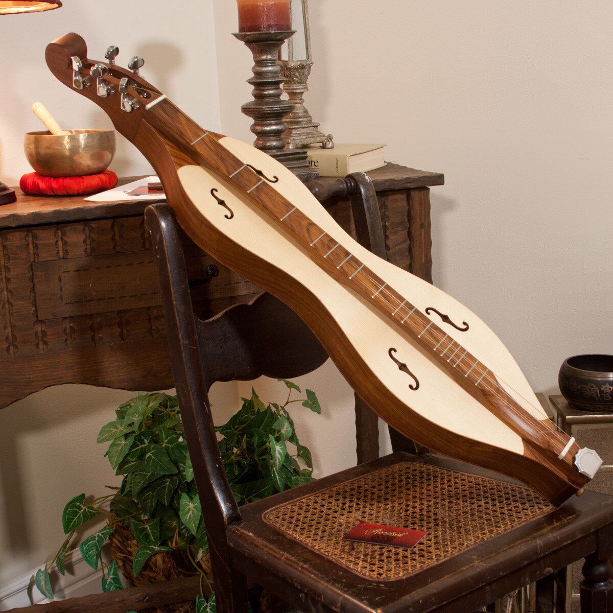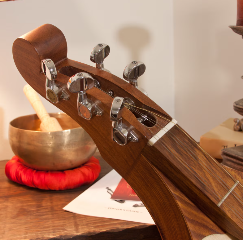 Traditionally, mountain dulcimers had three, equally spaced, strings: a melody string, a middle string, and a bass string. Later developments created a 4-string dulcimer by changing the string spacing and doubling the melody string. Doubling the melody string created greater volume to the melody line. Contemporary dulcimers, such as ours, include extra notches on the nut to allow more personalized string patterns. The inside doubled melody string can be removed completely to revert to the traditional 3-string set-up. Or the Inside melody string and the middle string can both be moved over one notch to create an equal spacing between all four strings. Find the set-up that works best for you.